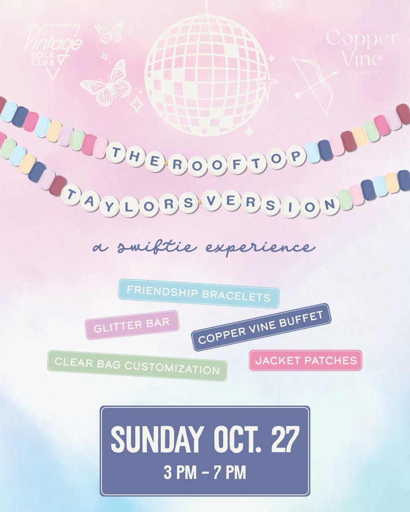 Friendship Bracelet Making | Glitter Bar | Sparkle & Swag Heat Press Station | Full Buffet | Cash Bar | Mocktails | Rooftop Views | Vintage Rock Club Music Experience