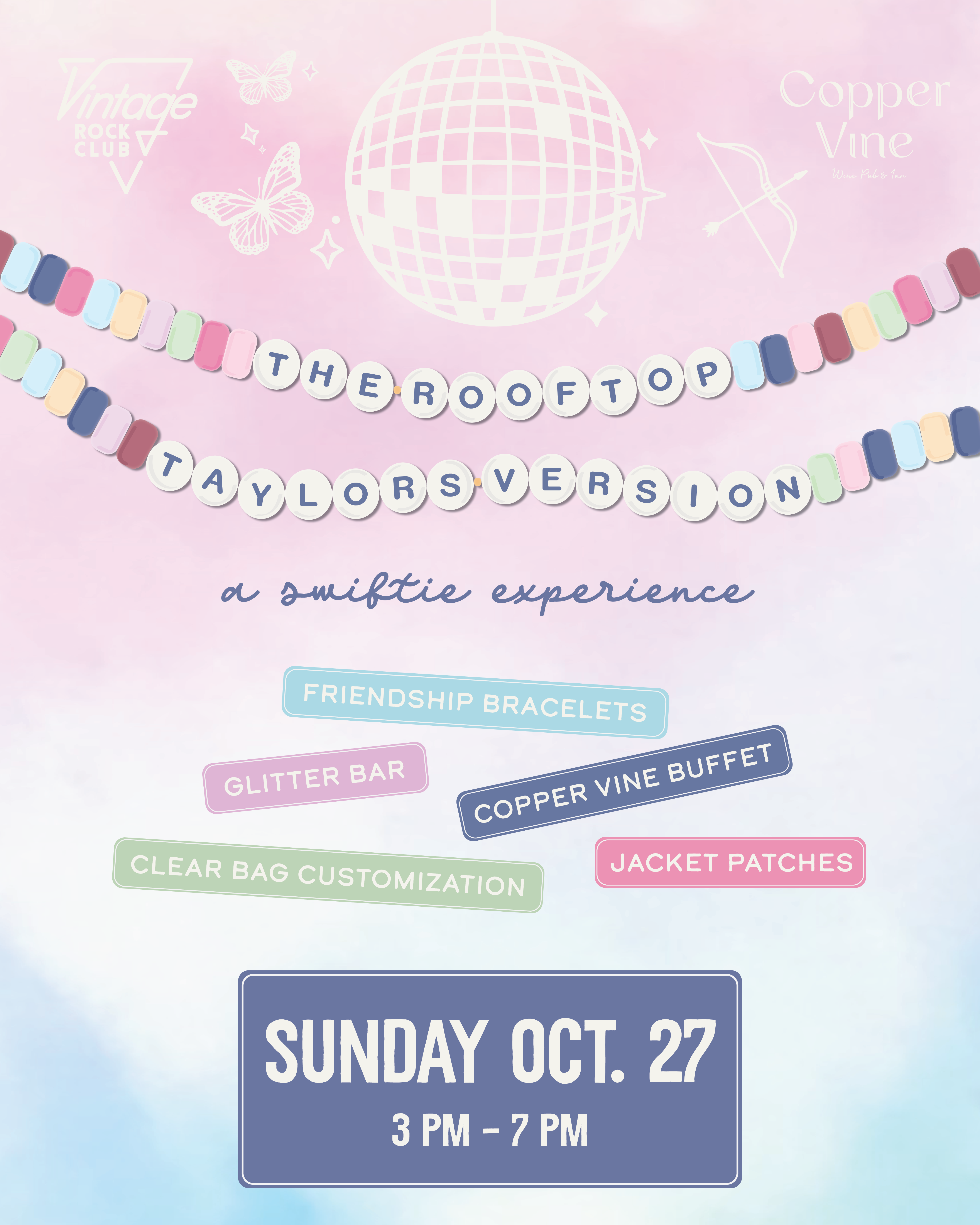 Friendship Bracelet Making | Glitter Bar | Sparkle & Swag Heat Press Station | Full Buffet | Cash Bar | Mocktails | Rooftop Views | Vintage Rock Club Music Experience
