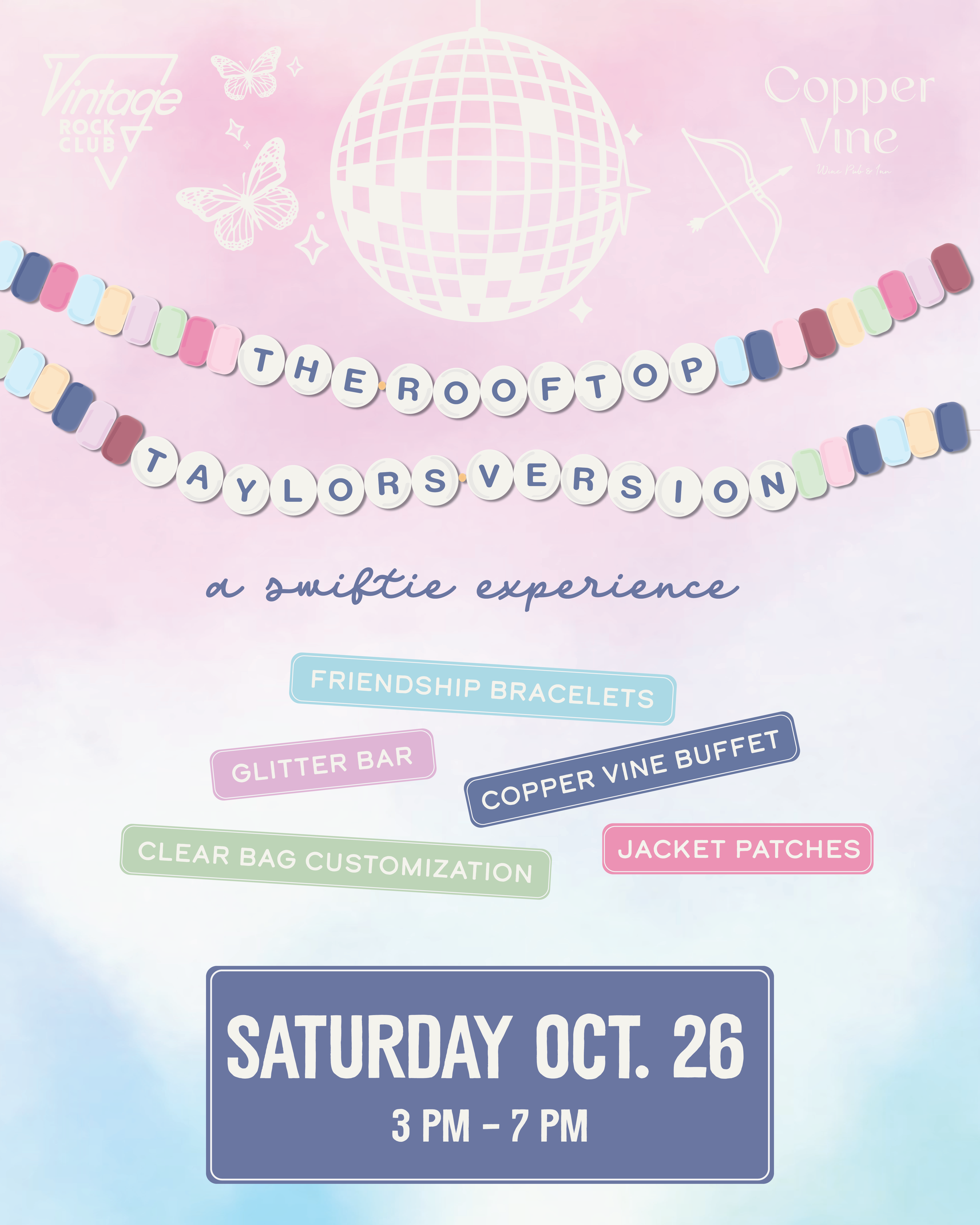 Friendship Bracelet Making | Glitter Bar | Sparkle & Swag Heat Press Station | Full Buffet | Cash Bar | Rooftop Views | Vintage Rock Club Music Experience